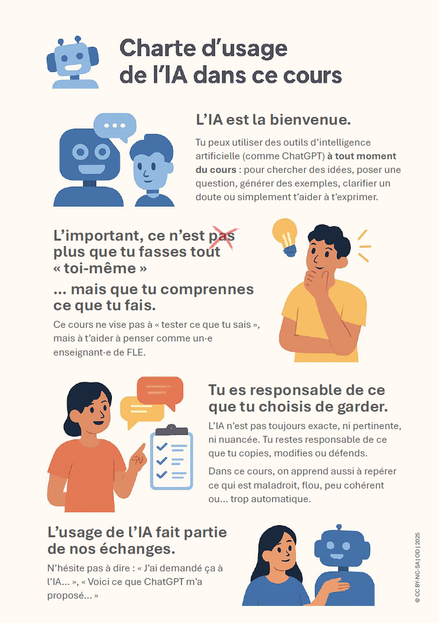 Cette page vous invite à explorer l’univers de l’intelligence artificielle comme alliée de votre apprentissage ou de votre enseignement en FLE. Vous y trouverez une sélection d’outils réellement accessibles, gratuits dans leur version de base au moins, pour vous aider à comprendre, produire, corriger, créer… autrement. Une charte d’usage simple accompagne cette sélection pour encourager une utilisation raisonnée, bienveillante et formatrice de ces outils.
